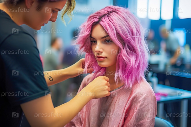 Красивая девушка с розовыми волосами в парикмахерской. Генеративный ИИ. Иллюстрация высокого качества
