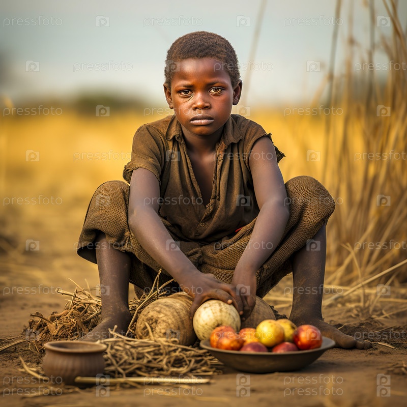 Африканский голодный мальчик сидит на земле и ест. Генеративный ИИ