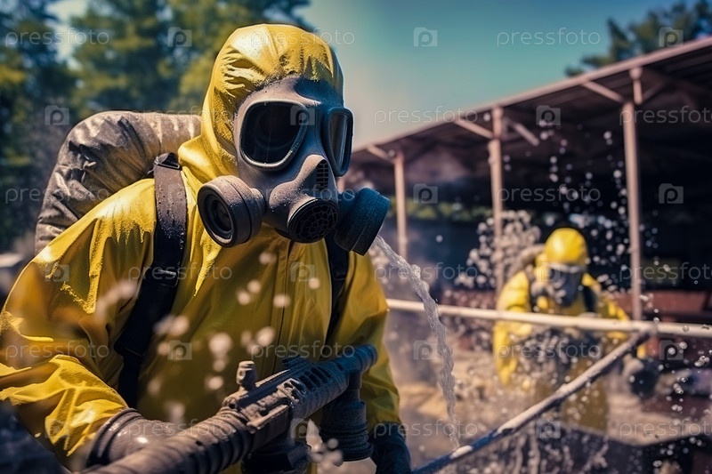 Мужчина в костюме химзащиты от радиации опрыскивает территорию. Генеративный ИИ