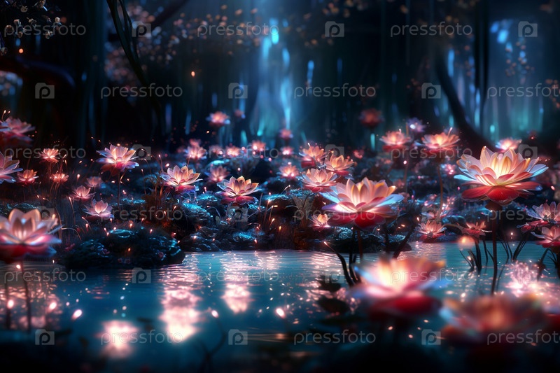 Сказочный лес окутан легким сиянием люминесцентных растений и светлячков