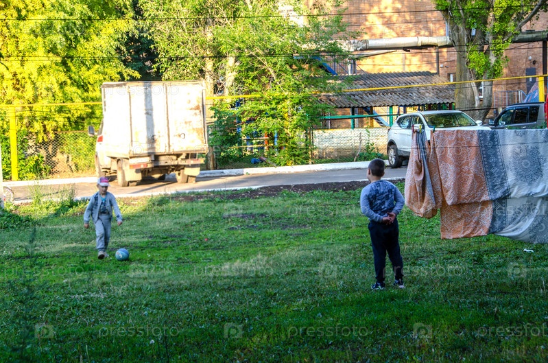 Два мальчика в деревне играют в футбол рядом с домом