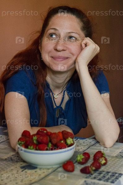 Рыжеволосая деввушка с тарелкой клубники за столом