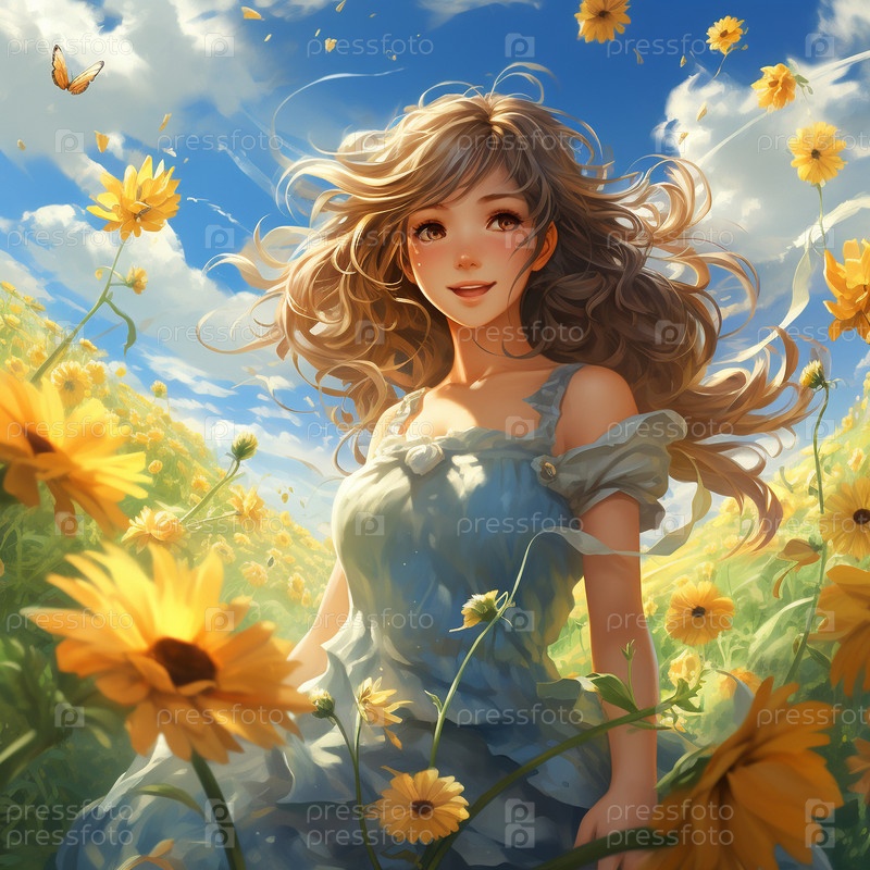 Счастливая девушка в солнечном поле цветов