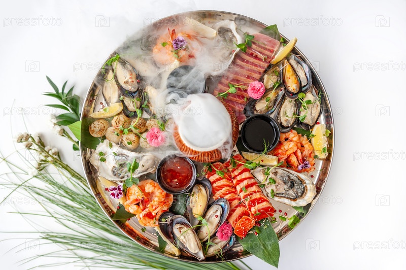 Тарелка свежих морепродуктов с мидиями, устрицами, гребешком и тунцом