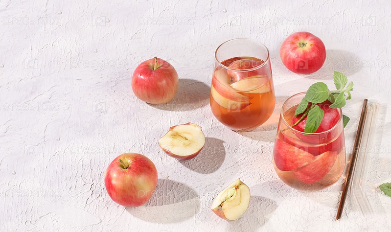 Яблочный сидр, сок или морс в стакане на солнечном столе, осенний витаминный глинтвейн с кусочками яблок. Концепция диеты и потери веса. Яблоки помогают очистить организм и снизить вес. Выборочный фокус