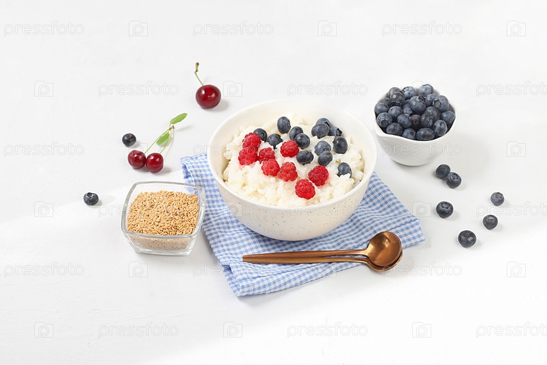 Здоровый завтрак с ингредиентами, молочная рисовая каша со свежей черникой, вишней и малиной, сливочный рисовый пудинг с семенами льна и ромашковый чай. Концепция естественного питания и потери веса, выборочная направленность
