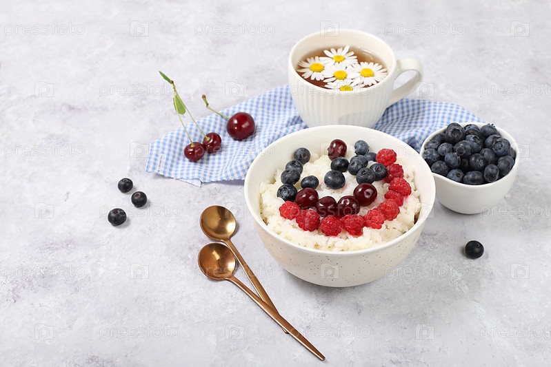 Здоровый завтрак с ингредиентами, молочная рисовая каша со свежей черникой, вишней и малиной, сливочный рисовый пудинг или французский рис с медом и ромашковым чаем. Концепция естественного питания, еда для детей, избирательный подход