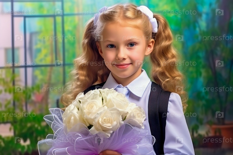 Портрет первоклассницы с букетом цветов. Генеративный ИИ