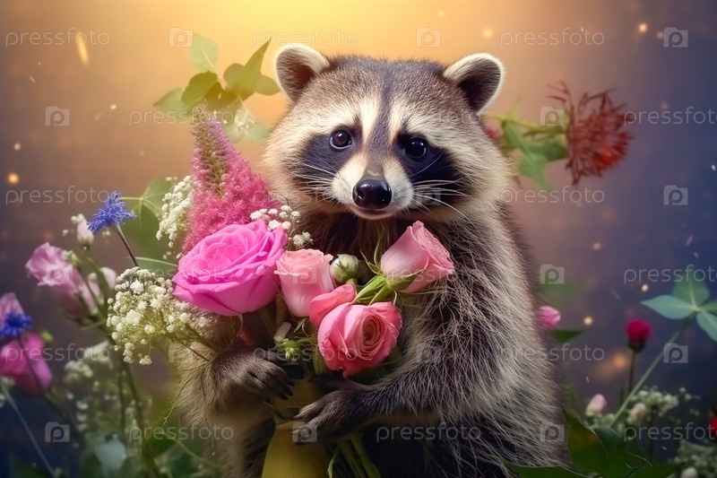 Забавный, пушистый енот с букетом цветов. Генеративный ИИ