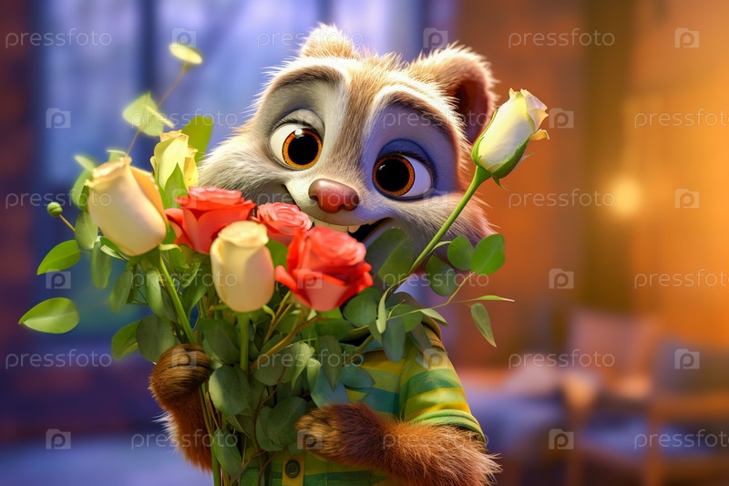Забавный, пушистый енот с букетом цветов. Генеративный ИИ
