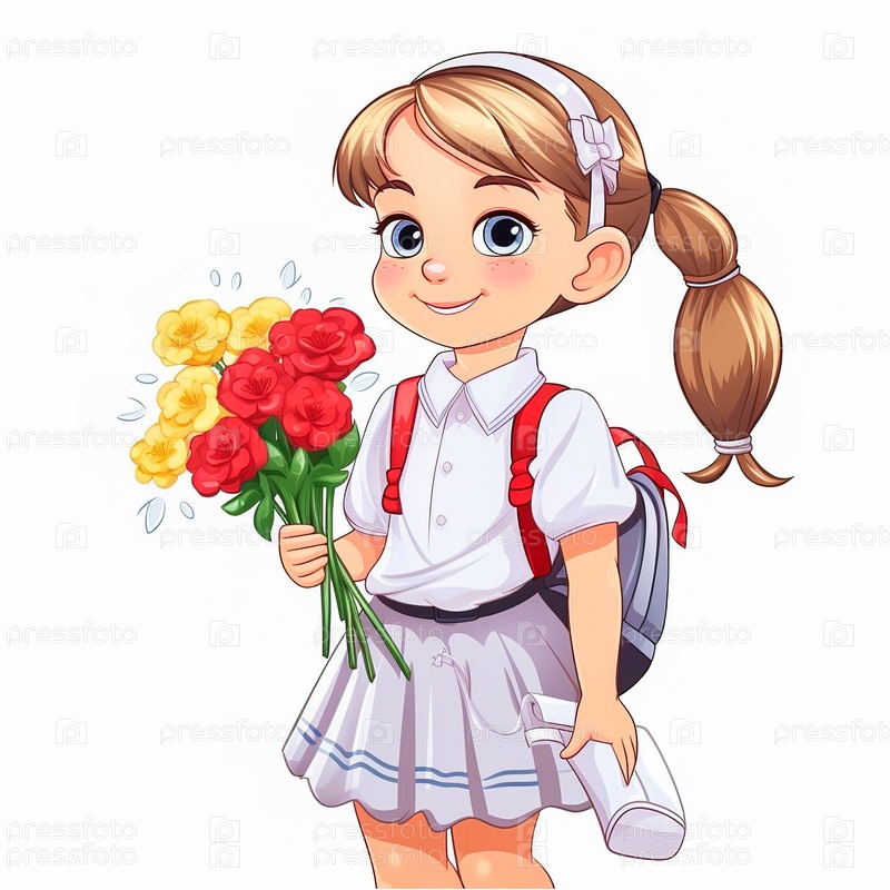 Первоклассница с букетом цветов в руках. Генеративный ИИ