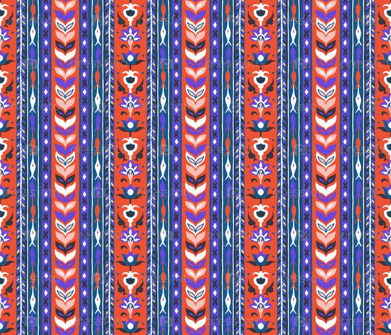 Геометрический дамасский орнамент. Икат границы. Этническая вышивка с листьями и монограммами. Племенная векторная текстура. Бесшовный народный узор в ацтекском стиле. Индийский, скандинавский, цыганский, мексиканский, африканский ковер