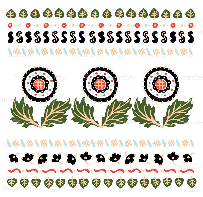 Набор этнических элементов. Бордюр представляет собой полосу с цветами, листьями, ветками, вензелями. Народная вышивка. Славянский, украинский, русский мотив. Хохлома, матрешка, дымковская игрушка. Мексиканский, индийский, цыганский ковер. Вязаное кружево