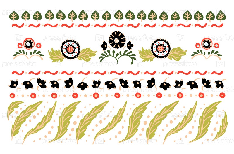 Набор этнических элементов. Бордюр представляет собой полосу с цветами, листьями, ветками, вензелями. Народная вышивка. Славянский, украинский, русский мотив. Хохлома, матрешка, дымковская игрушка. Мексиканский, индийский, цыганский ковер. Вязаное кружево