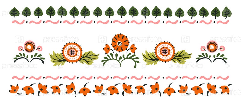Набор этнических элементов. Бордюр представляет собой полосу с цветами, листьями, ветками, вензелями. Народная вышивка. Славянский, украинский, русский мотив. Хохлома, матрешка, дымковская игрушка. Мексиканский, индийский, цыганский ковер. Вязаное кружево