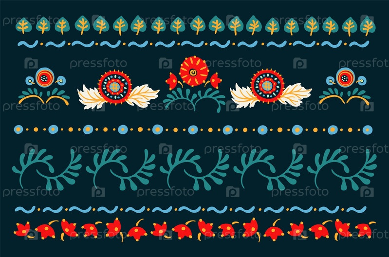 Набор этнических элементов. Бордюр представляет собой полосу с цветами, листьями, ветками, вензелями. Народная вышивка. Славянский, украинский, русский мотив. Хохлома, матрешка, дымковская игрушка. Мексиканский, индийский, цыганский ковер. Вязаное кружево