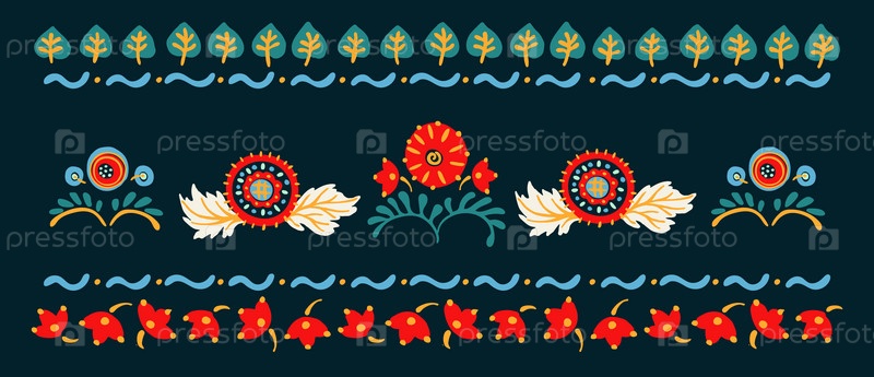 Набор этнических элементов. Бордюр представляет собой полосу с цветами, листьями, ветками, вензелями. Народная вышивка. Славянский, украинский, русский мотив. Хохлома, матрешка, дымковская игрушка. Мексиканский, индийский, цыганский ковер. Вязаное кружево