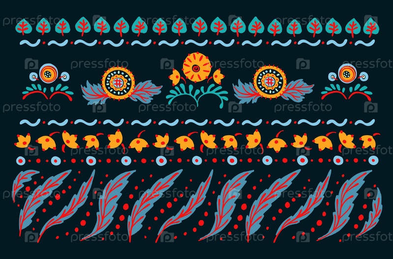 Набор этнических элементов. Бордюр представляет собой полосу с цветами, листьями, ветками, вензелями. Народная вышивка. Славянский, украинский, русский мотив. Хохлома, матрешка, дымковская игрушка. Мексиканский, индийский, цыганский ковер. Вязаное кружево