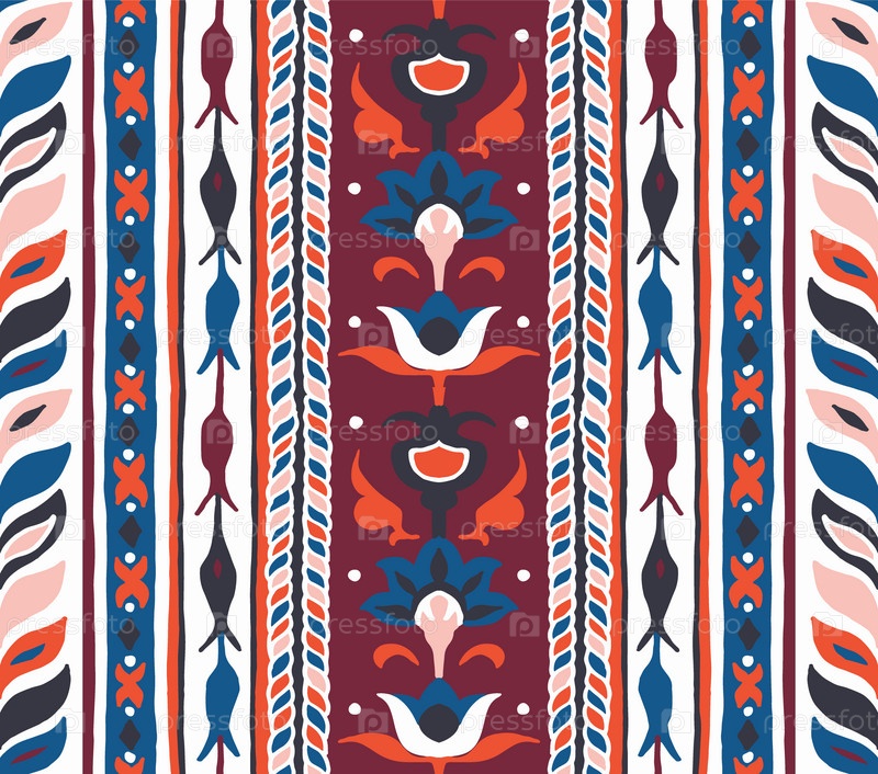 Набор этнических элементов. Бордюр представляет собой полосу с цветами, листьями, ветками, вензелями. Народная вышивка. Славянский, украинский, русский мотив. Хохлома, матрешка, дымковская игрушка. Мексиканский, индийский, цыганский ковер. Вязаное кружево