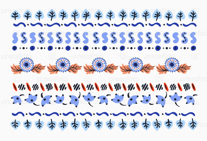 Набор этнических элементов. Бордюр представляет собой полосу с цветами, листьями, ветками, вензелями. Народная вышивка. Славянский, украинский, русский мотив. Хохлома, матрешка, дымковская игрушка. Мексиканский, индийский, цыганский ковер. Вязаное кружево