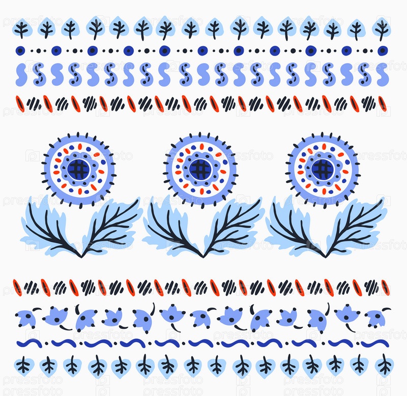 Набор этнических элементов. Бордюр представляет собой полосу с цветами, листьями, ветками, вензелями. Народная вышивка. Славянский, украинский, русский мотив. Хохлома, матрешка, дымковская игрушка. Мексиканский, индийский, цыганский ковер. Вязаное кружево