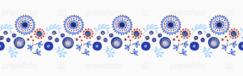 Набор этнических элементов. Бордюр представляет собой полосу с цветами, листьями, ветками, вензелями. Народная вышивка. Славянский, украинский, русский мотив. Хохлома, матрешка, дымковская игрушка. Мексиканский, индийский, цыганский ковер. Вязаное кружево