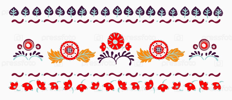 Набор этнических элементов. Бордюр представляет собой полосу с цветами, листьями, ветками, вензелями. Народная вышивка. Славянский, украинский, русский мотив. Хохлома, матрешка, дымковская игрушка. Мексиканский, индийский, цыганский ковер. Вязаное кружево