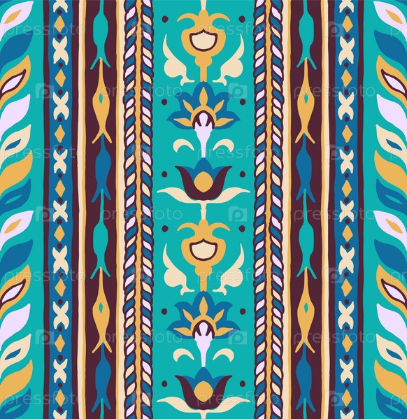 Геометрический дамасский орнамент. Икат границы. Этническая вышивка с листьями и монограммами. Племенная векторная текстура. Бесшовный народный узор в ацтекском стиле. Индийский, скандинавский, цыганский, мексиканский, африканский ковер