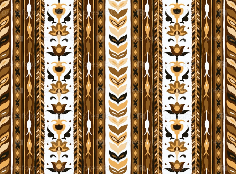 Геометрический дамасский орнамент. Икат границы. Этническая вышивка с листьями и монограммами. Племенная векторная текстура. Бесшовный народный узор в ацтекском стиле. Индийский, скандинавский, цыганский, мексиканский, африканский ковер