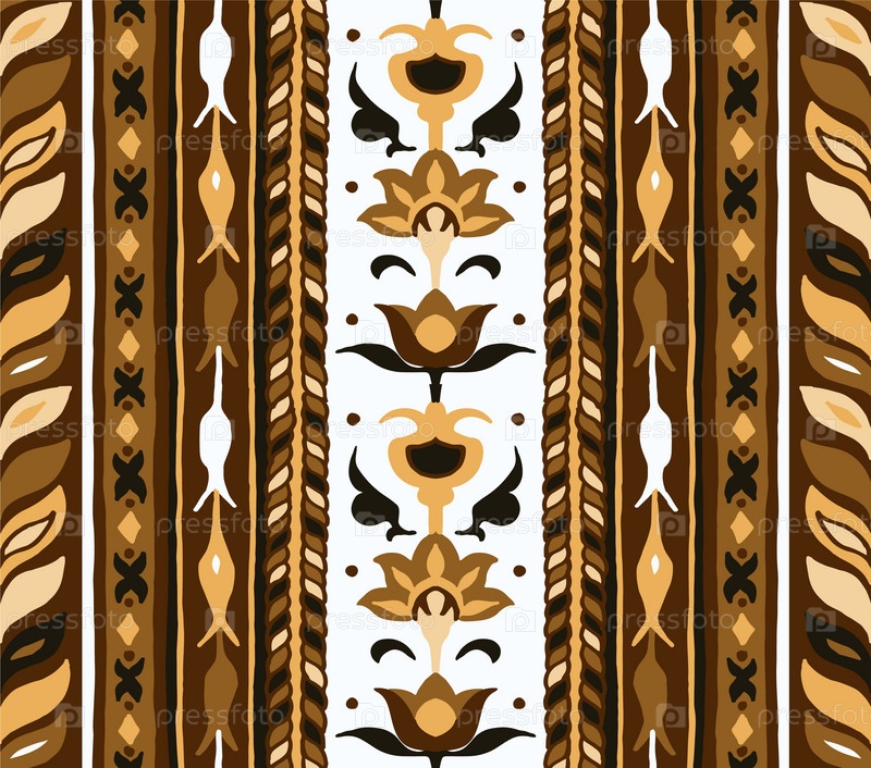 Геометрический дамасский орнамент. Икат границы. Этническая вышивка с листьями и монограммами. Племенная векторная текстура. Бесшовный народный узор в ацтекском стиле. Индийский, скандинавский, цыганский, мексиканский, африканский ковер