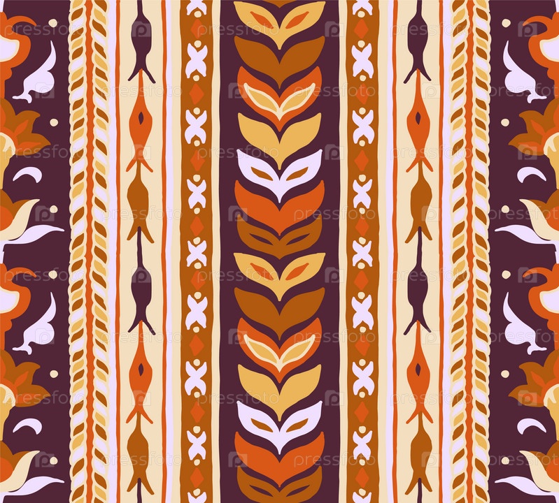Геометрический дамасский орнамент. Икат границы. Этническая вышивка с листьями и монограммами. Племенная векторная текстура. Бесшовный народный узор в ацтекском стиле. Индийский, скандинавский, цыганский, мексиканский, африканский ковер
