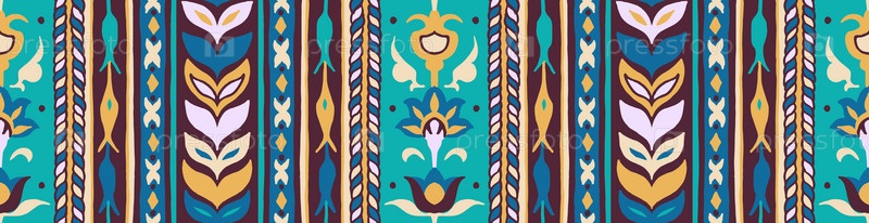 Геометрический дамасский орнамент. Икат границы. Этническая вышивка с листьями и монограммами. Племенная векторная текстура. Бесшовный народный узор в ацтекском стиле. Индийский, скандинавский, цыганский, мексиканский, африканский ковер
