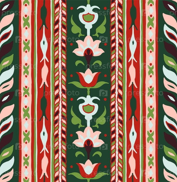 Геометрический дамасский орнамент. Икат границы. Этническая вышивка с листьями и монограммами. Племенная векторная текстура. Бесшовный народный узор в ацтекском стиле. Индийский, скандинавский, цыганский, мексиканский, африканский ковер