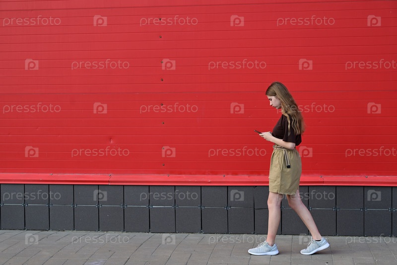 Портрет молодой студентки, читающей сообщение по мобильному телефону, стильной красивой девушки, болтающей по мобильному телефону во время прогулки по улице