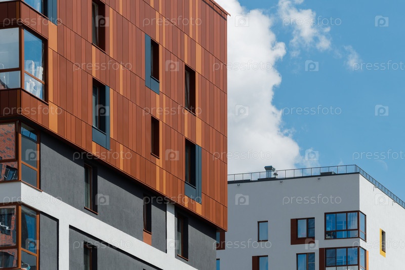 Новый жилой дом в скандинавском стиле на фоне голубого неба в солнечный день
