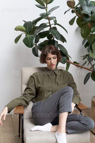 Молодая красивая женщина сидит на стуле в зеленой блузке