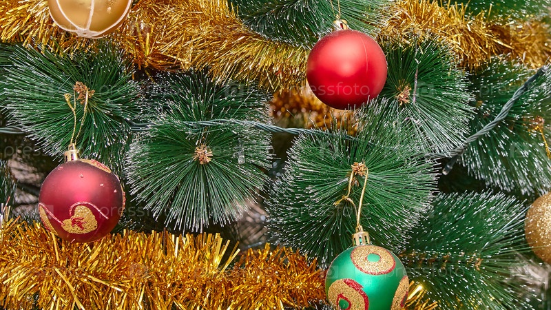 Фрагмент искусственной елки, украшенный цветными шарами, пушистой гирляндой и электрической гирляндой. Рождественская елка. Рождество. Горизонтальное фото. Фон для дизайнера