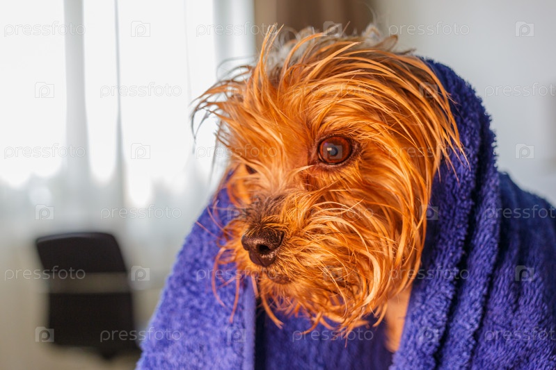Йоркширский терьер, завернутый в полотенце после купания. Милая и забавная собака. Портрет пушистой собаки крупным планом