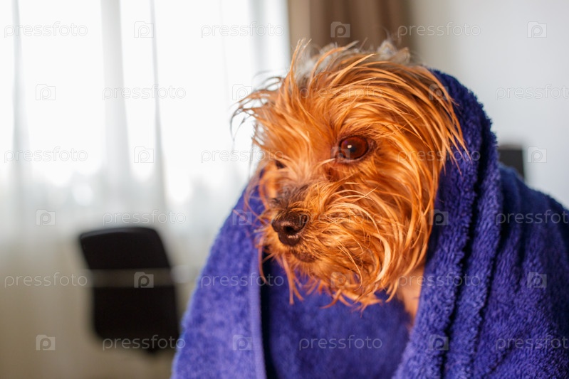 Йоркширский терьер, завернутый в полотенце после купания. Милая и забавная собака. Портрет пушистой собаки крупным планом