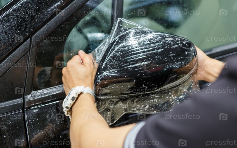Процесс установки ППФ на боковое зеркало. PPF - защитная пленка для краски, которая защищает краску от царапин и гравия. Защита от гравитации. Окружение автомобиля в крупном плане
