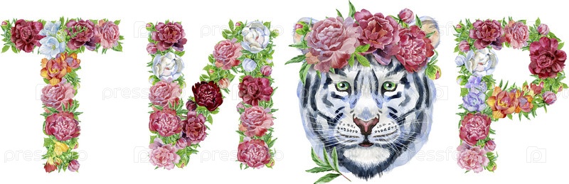 Слово ТИГР на русском языке из акварельных цветов, изолированная рука, нарисованная на белом фоне, свадебный дизайн