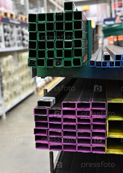 Стальная труба, квадратная труба из высокоуглеродистого металла для строительной площадки. Фон металлургии
