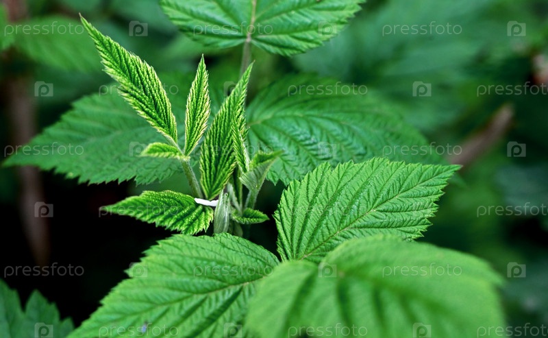 Первые молодые листья малины. Антиоксидант. Травяной чай. Крупный план новых листьев. Размытый фон