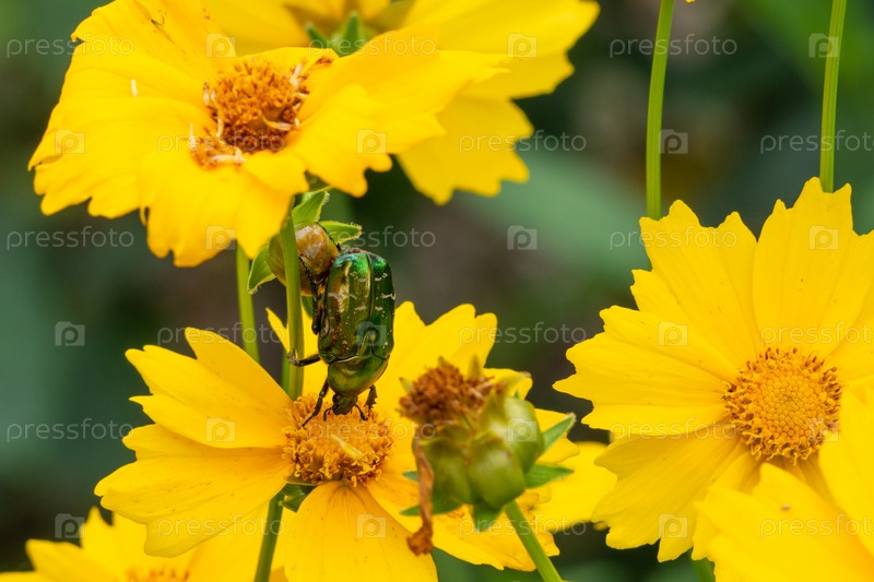 Зелёный жук съедает пыльцу на желтом цвете в крупном плане