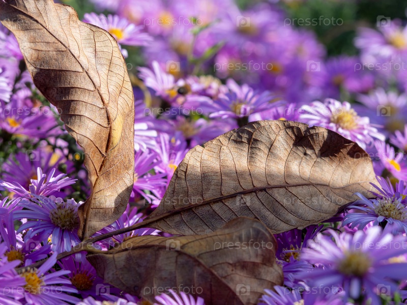 Крупный план текстурированного желтого опавшего осеннего листа на цветущей поляне цветов альпийской астры, малая глубина резкости. Концепция жизни и смерти