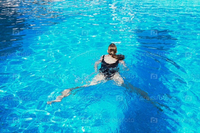 Молодая женщина плавает на воде в бассейне