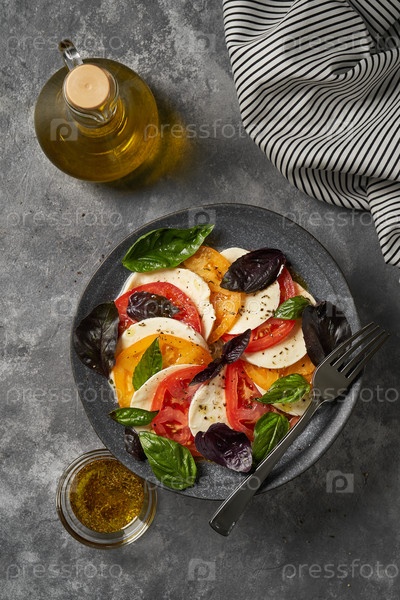 Салат капрезе на тарелке на сером фоне
