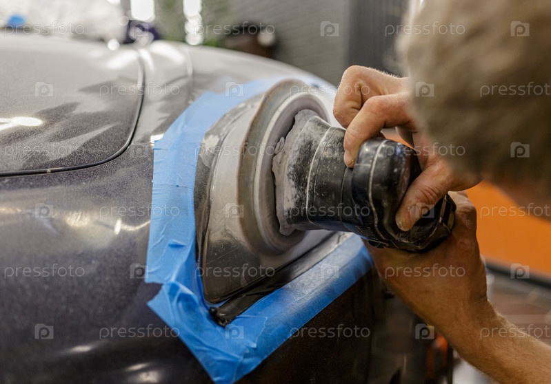Человек очищает фары с помощью выборочной фокусировки полировальной машины. Крупный план