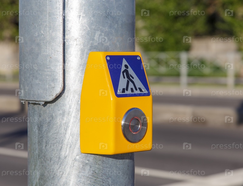 Пешеходный знак и кнопка на пешеходном переходе. Зебра, призывающая людей дождаться соответствующего сигнала и нажать на кнопку. Безопасность пешеходов