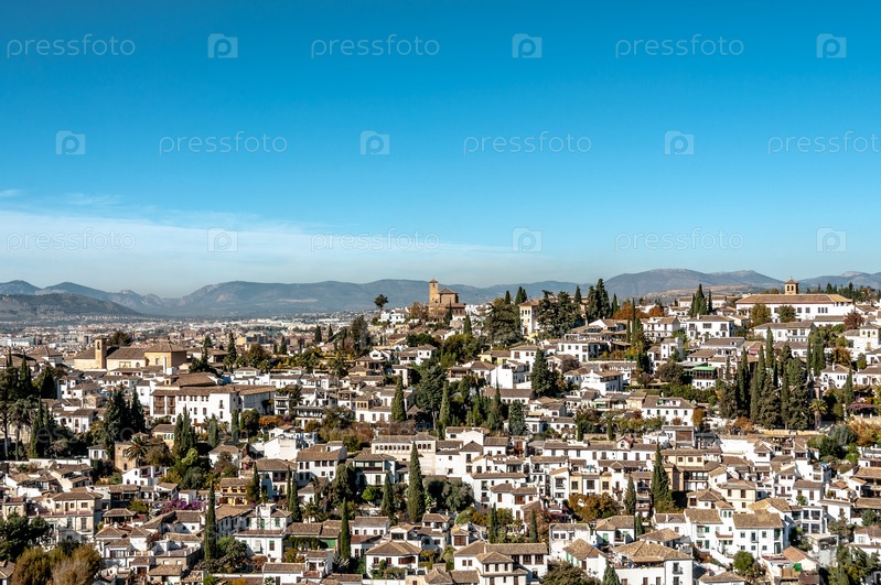 Панорама старого города под синим небом, горы на заднем плане